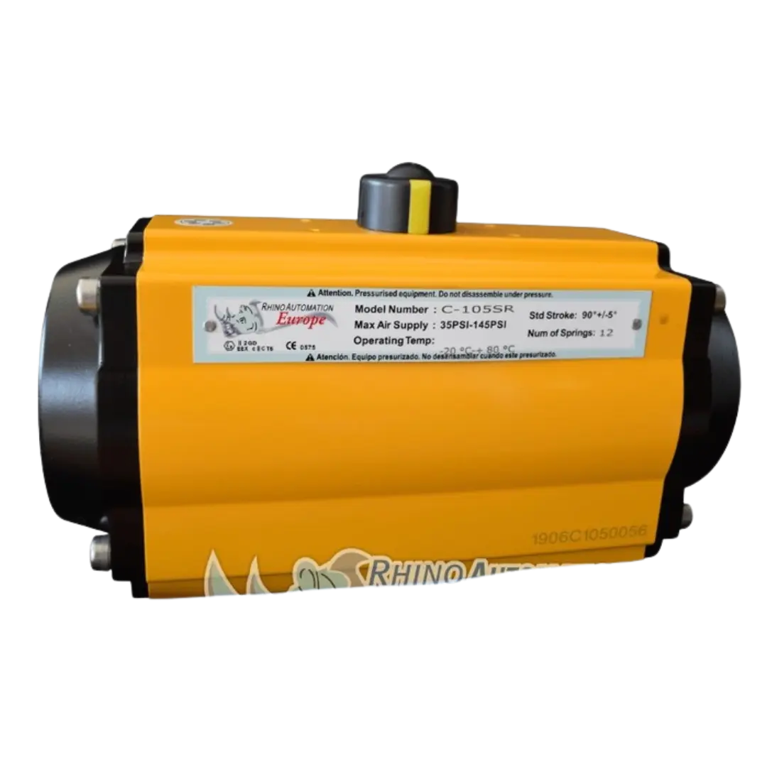 Actuador neumatico de piñon y cremallera Rhino automation, montaje conforme ISO 5211, torque de 100 a 28,500 lb-in, disponible en doble accion y simple accion