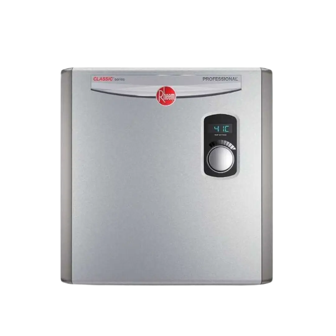 Calentador instantaneo electrico de 14.3 litros/minuto para 3 servicios, modelo RTX3-27, encendido automatico por demanda de agua, control por medio de perilla reguladora y display LED, alimentacion electrica 240 Volts Corriente Alterna, 112 amperes, 27 kW